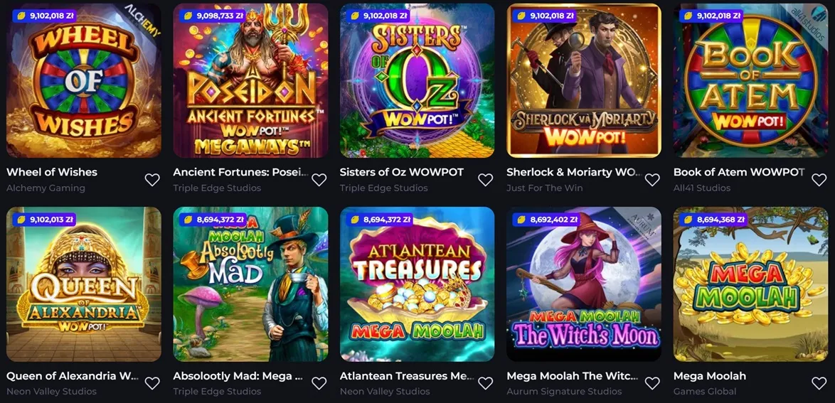 Dzięki współpracy z renomowanymi dostawcami oprogramowania, takimi jak Big Time Gaming ,Pragmatic Play czy Spinomenal, strona zapewnia najwyższą jakość rozgrywki. Automaty charakteryzują się nowoczesną grafiką, innowacyjnymi funkcjami specjalnymi oraz różnymi poziomami zmienności, dzięki czemu każdy gracz znajdzie coś dla siebie.